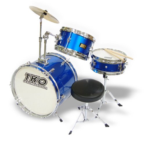 Wholesale TKO 3-Piece Junior Drum Set With Seat - Blue. The TKO-99 Junior children's drum set is sized just right for the young student drummer. This durable quality drum set will hold up to your child's playing. It features fully tunable top and bottom heads, real wood shells and chrome plated metal hardware! The snare drum and adjustible angle tom are both 10" and have 4 lugs each. The 16" bass drum has 12 lugs and features attractive color-matched inlaid rims for a pro-like "look".